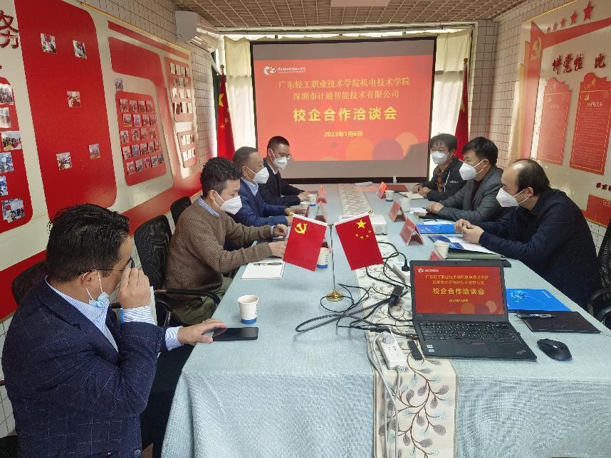 2023年1月6日,深圳市计通智能技术有限公司董事长张毅、总经理蒋志文、副总经理陈灿峰等一行莅临机电技术学院洽谈校企合作,学院院长张友能、副院长毛诗柱、专任教师戴钰等在南海校区北区行政楼2200室接待了来访客人,双方就校企合作、产教融合、项目攻关与学生就业等进行了深入洽谈交流。