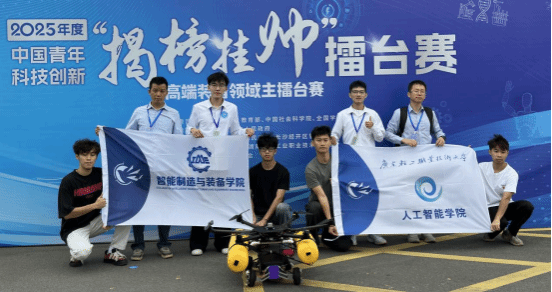 10 月 14 日,2025 年度中国青年科技创新 “揭榜挂帅” 擂台赛 “高端装备领域” 终审主擂台赛在湖南长沙落下帷幕。广东轻工职业技术学院智能制造与装备学院和人工智能学院学生团队(学生:罗信淳、卢湘强、朱保利、吴标锐、文金良、黄春霖、潘耀权、杨妙君、盘子锋;指导老师:潘朝、周启业、叶宜生)凭借作品“鸢霁”海陆空三栖无人器,从全国众多参赛作品中脱颖而出,斩获 “海陆空三栖无人器设计” 榜题学生赛道全国三等奖。