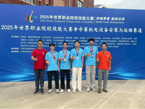 在9月17日至21日于天津举办的“机电设备安装与运维赛道(高职组)”中,由吴任和、关春天老师指导,荆胤轩、尤洪富、明力凡、邓梓轩四位同学组成的团队,凭借扎实技能操作和智能产线赋能,从全国81支队伍中脱颖而出,荣获铜奖,充分展现了我院在机电装备应用与智能产线集成方面的教学成果。